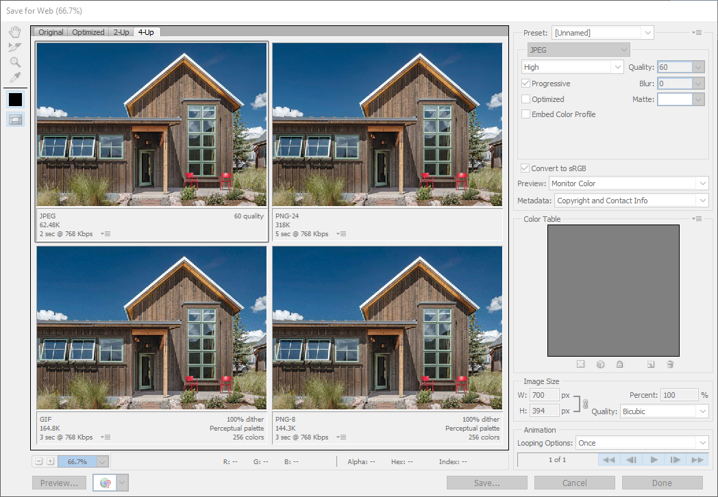 Here is the house image covered in the JPEG section being saved in Photoshop. You can see what it might look like being saved as other image formats and why JPEG is the best format for this particular image.